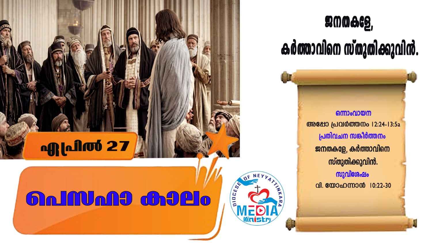 അല്ലേലൂയാ! (യോഹ 10:27). കർത്താവ് അരുൾചെയ്യുന്നു. എൻ്റെ ആടുകൾ എൻ്റെ സ്വരം ശ്രവിക്കുന്നു. എനിക്ക് അവയെ അറിയാം. അവ എന്നെ അനുഗമിക്കുന്നു. – അല്ലേലൂയാ!