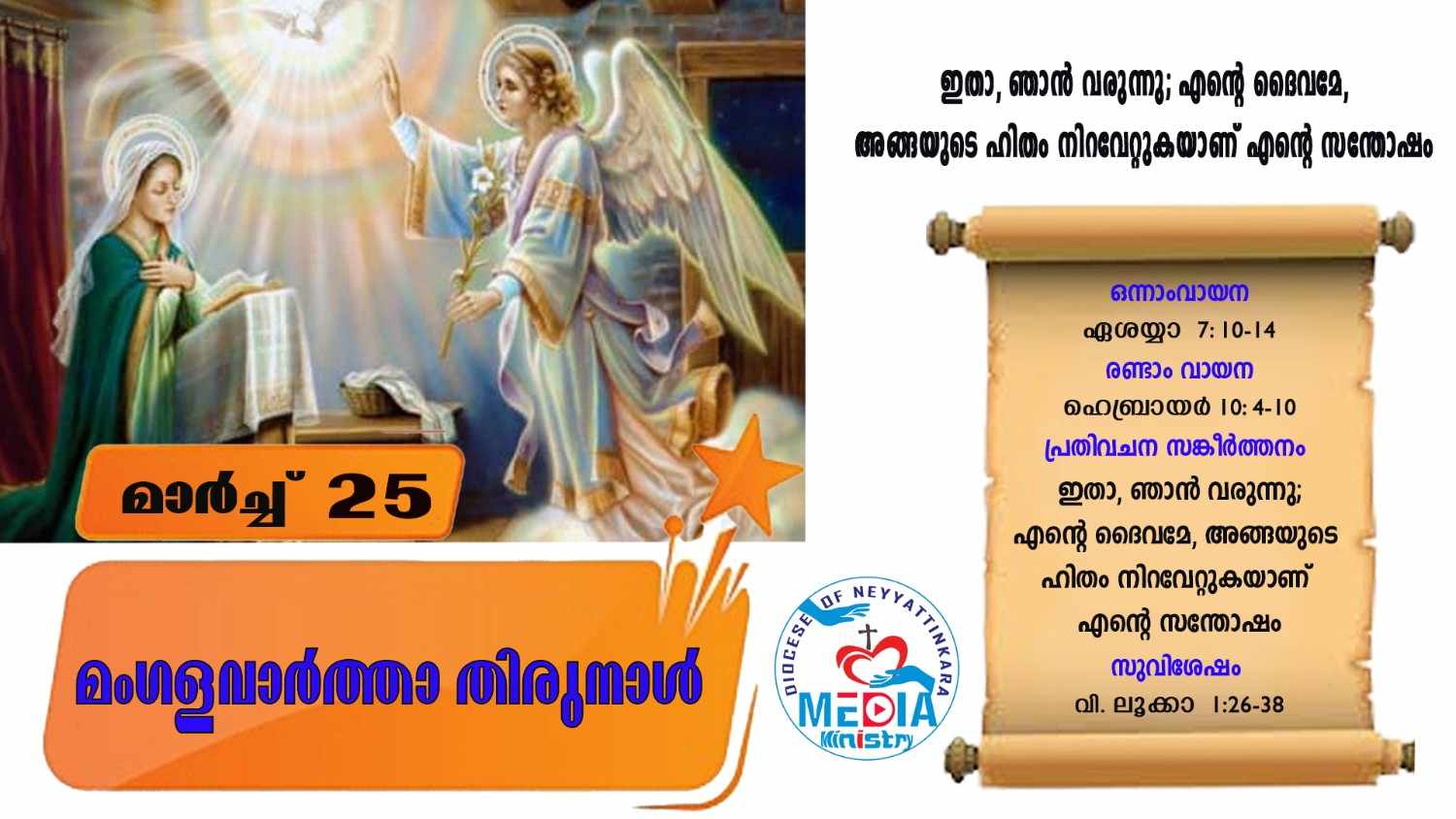 അക്കാലത്ത്, ഗബ്രിയേൽദുതൻ ഗലീലിയിൽ നസറത്ത് എന്ന പട്ടണത്തിൽ, ദാവീദിന്റെ വംശത്തിൽപ്പെട്ട ജോസഫ് എന്നുപേരുള്ള പുരുഷനുമായി വിവാഹനിശ്ചയം ചെയ്തിരുന്ന കന്യകയുടെ അടുത്തേക്ക്, ദൈവത്താൽ അയയ്ക്കപ്പെട്ടു. അവളുടെ പേര് മറിയം എന്നായിരുന്നു ദൂതൻ അവളുടെ അടുത്തു വന്നു പറഞ്ഞു. ദൈവകൃപ നിറഞ്ഞവളേ! സ്വസ്തി, കർത്താവ് നിന്നോടുകൂടെ! ഈ വചനം കേട്ട് അവൾ ഏറെ അസ്വസ്ഥയായി; എന്താണ് ഈ അഭിവാദനത്തിന്റെ അർഥം എന്ന് അവൾ ചിന്തിച്ചു. ദൂതൻ അവളോടു പറഞ്ഞു: മറിയമേ, നീ ഭയപ്പെടേണ്ടാ; ദൈവസന്നിധിയിൽ നീ കൃപ കണ്ടെത്തിയിരിക്കുന്നു. നീ ഗർഭം ധരിച്ച് ഒരു പുത്രനെ പ്രസവിക്കും. നീ അവന് യേശു എന്നു പേരിടണം. അവൻ വലിയവനായിരിക്കും; അത്യുന്നതന്റെ പുത്രൻ എന്നു വിളിക്കപ്പെടും. അവന്റെ പിതാവായ ദാവീദിന്റെ സിംഹാസനം ദൈവമായ കർത്താവ് അവനു കൊടുക്കും. യാക്കോബിന്റെ ഭവനത്തിൻമേൽ അവൻ എന്നേക്കും ഭരണം നടത്തും. അവന്റെ രാജ്യത്തിന് അവസാനമുണ്ടാകയില്ല. മറിയം ദൂതനോടു പറഞ്ഞു: ഇതെങ്ങനെ സംഭവിക്കും? ഞാൻ പുരുഷനെ അറിയുന്നില്ലല്ലോ. ദൂതൻ മറുപടി പറഞ്ഞു: പരിശുദ്ധാത്മാവ് നിന്റെ മേൽ വരും; അത്യുന്നതന്റെ ശക്തി നിന്റെ മേൽ ആവസിക്കും. ആകയാൽ, ജനിക്കാൻ പോകുന്ന ശിശു പരിശുദ്ധൻ, ദൈവപുത്രൻ എന്നു വിളിക്കപ്പെടും. ഇതാ, നിന്റെ ചാർച്ചക്കാരി വൃദ്ധയായ എലിസബത്തും ഒരു പുത്രനെ ഗർഭം ധരിച്ചിരിക്കുന്നു. വന്ധ്യയെന്നു പറഞ്ഞിരുന്ന അവൾക്ക് ഇത് ആറാംമാസമാണ്. ദൈവത്തിന് ഒന്നും അസാധ്യമല്ല. മറിയം പറഞ്ഞു: ഇതാ, കർത്താവിൻ്റെ ദാസി! നിൻ്റെ വാക്ക് എന്നിൽ നിറവേറട്ടെ! അപ്പോൾ ദൂതൻ അവളുടെ മുമ്പിൽ നിന്നു മറഞ്ഞു..