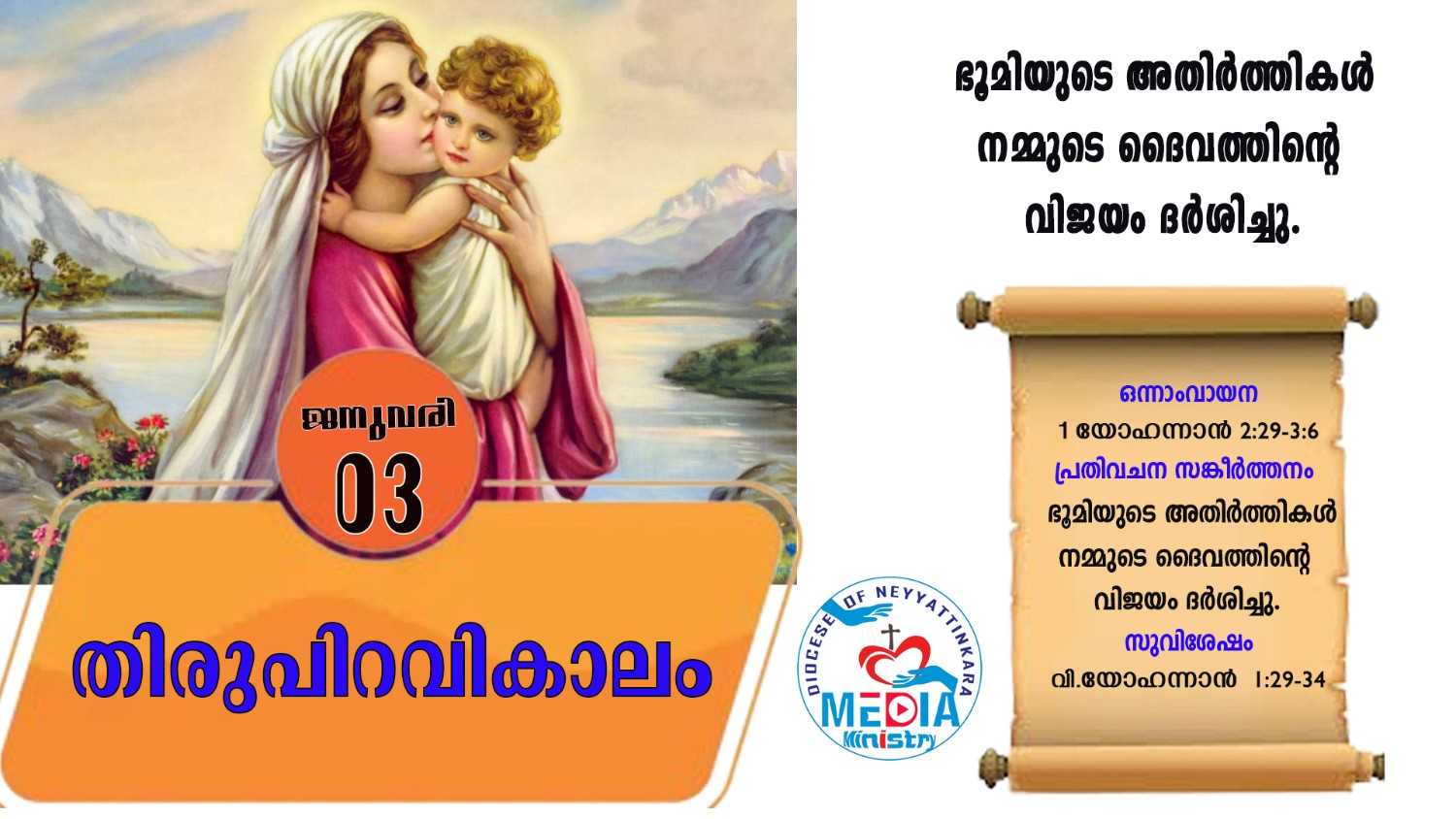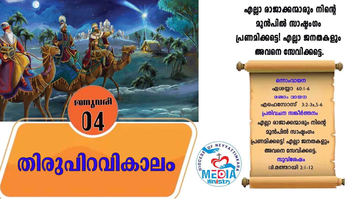 ജനുവരി 04 ഞായർ ഒന്നാം വായന ഏശയ്യാ പ്രവാചകന്റെ പുസ്തകത്തിൽൽനിന്ന് (കർത്താവിന്റെ മഹത്ത്വം നിന്റെമേൽ ഉരിച്ചിരിക്കുന്നു) ജറുസലേമേ, ഉണർന്നു പ്രശോഭിക്കുക; നിന്റെ പ്രകാശം വന്നുചേർന്നിരിക്കുന്നു. കർത്താവിന്റെ മഹത്ത്വം നിന്റെ മേൽ ഉദിച്ചിരിക്കുന്നു. അന്ധകാരം ഭൂമിയെയും കുരിരുട്ട് ജനതകളെയും മൂടും. എന്നാൽ, കർത്താവ് നിന്റെമേൽ ഉദിക്കുകയും അവിടത്തെ മഹത്ത്വം നിന്നിൽ ദൃശ്യമാവുകയും ചെയ്യും. ജനതകൾ നിന്റെ പ്രകാശത്തിലേക്കും രാജാക്കൻമാർ നിന്റെ ഉദയ ശോഭയിലേക്കും വരും. കണ്ണുകളുയർത്തി ചുറ്റും നോക്കിക്കാണുക; അവർ ഒരുമിച്ചുകൂടി നിന്റെ അടുത്തേക്കു വരുന്നു. നിന്റെ പുത്രൻമാർ […]